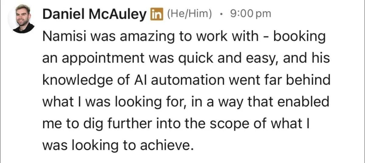 It's been a pleasure working with Namisi, and I'm happy to recommend him to any business looking to harness AI to work smarter and more efficiently